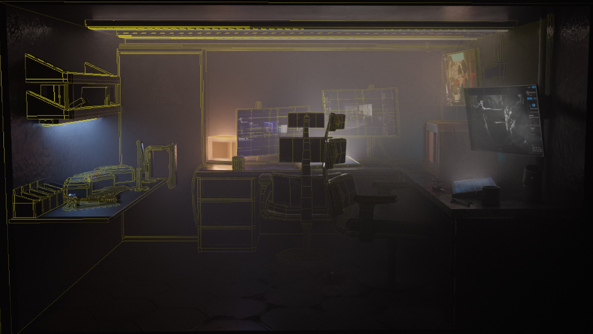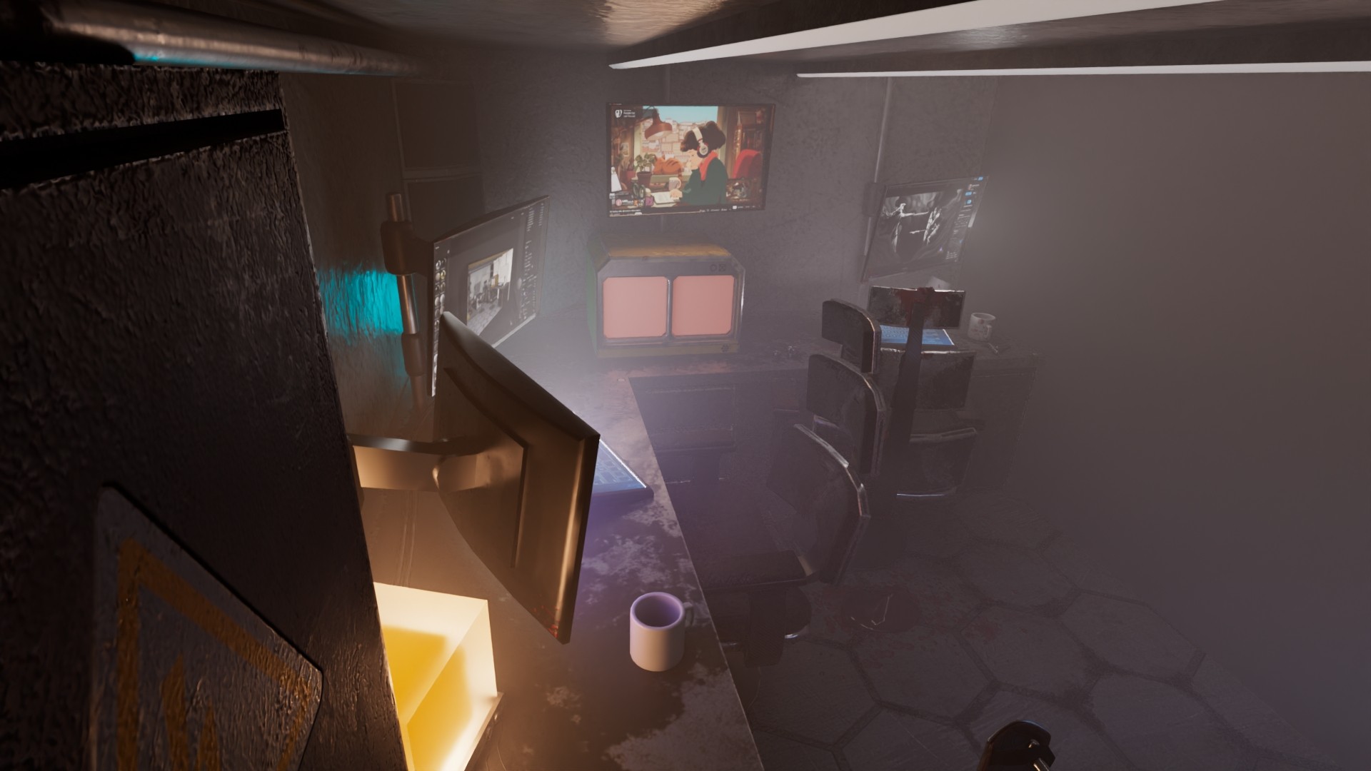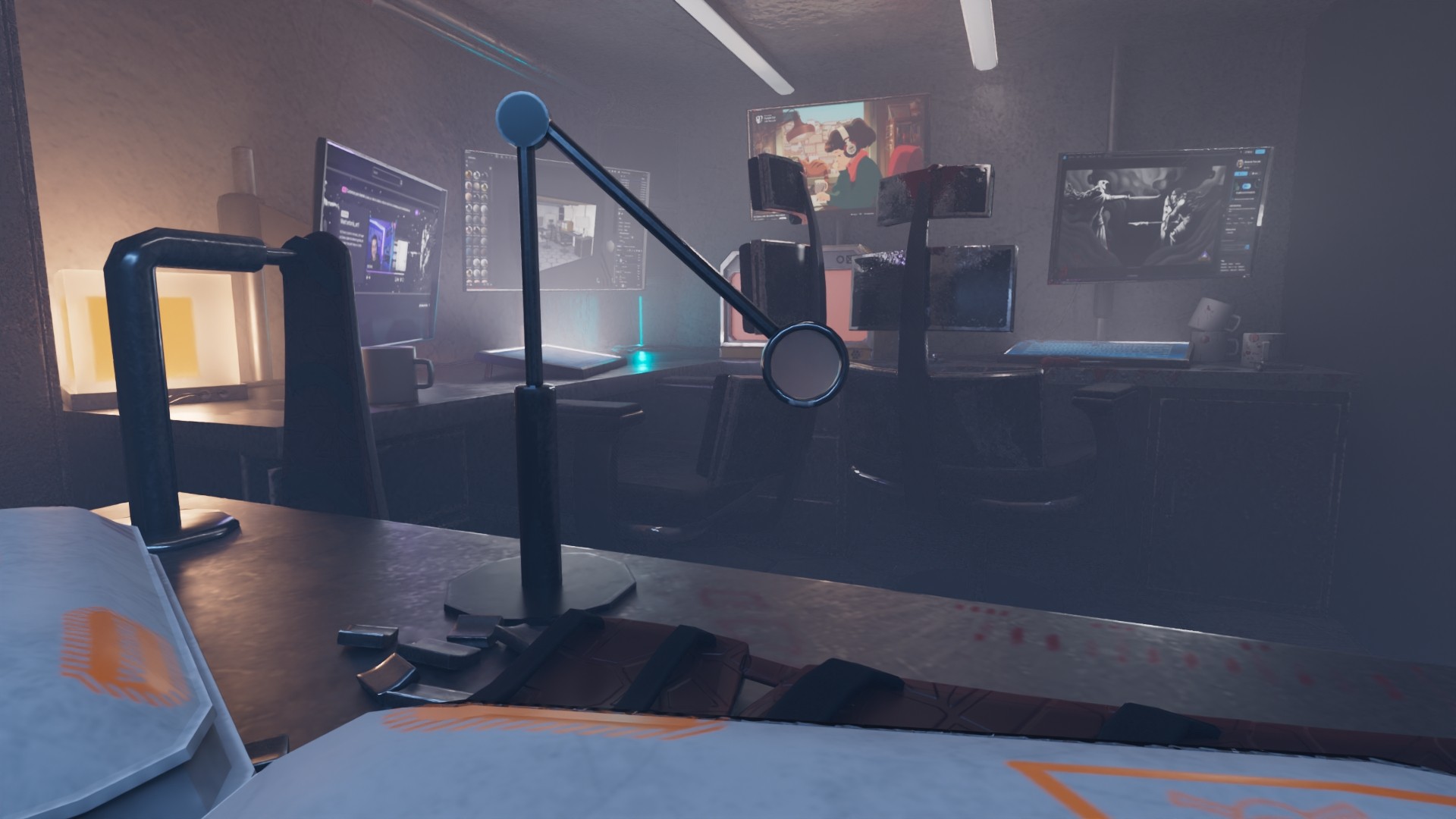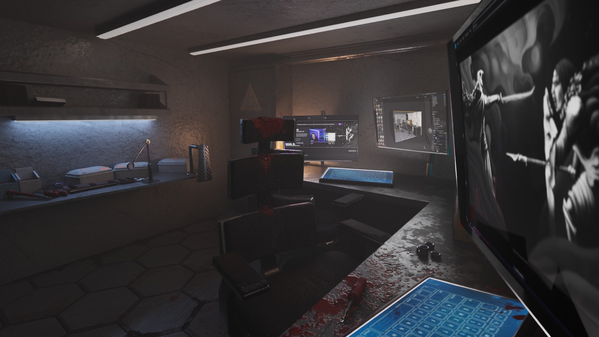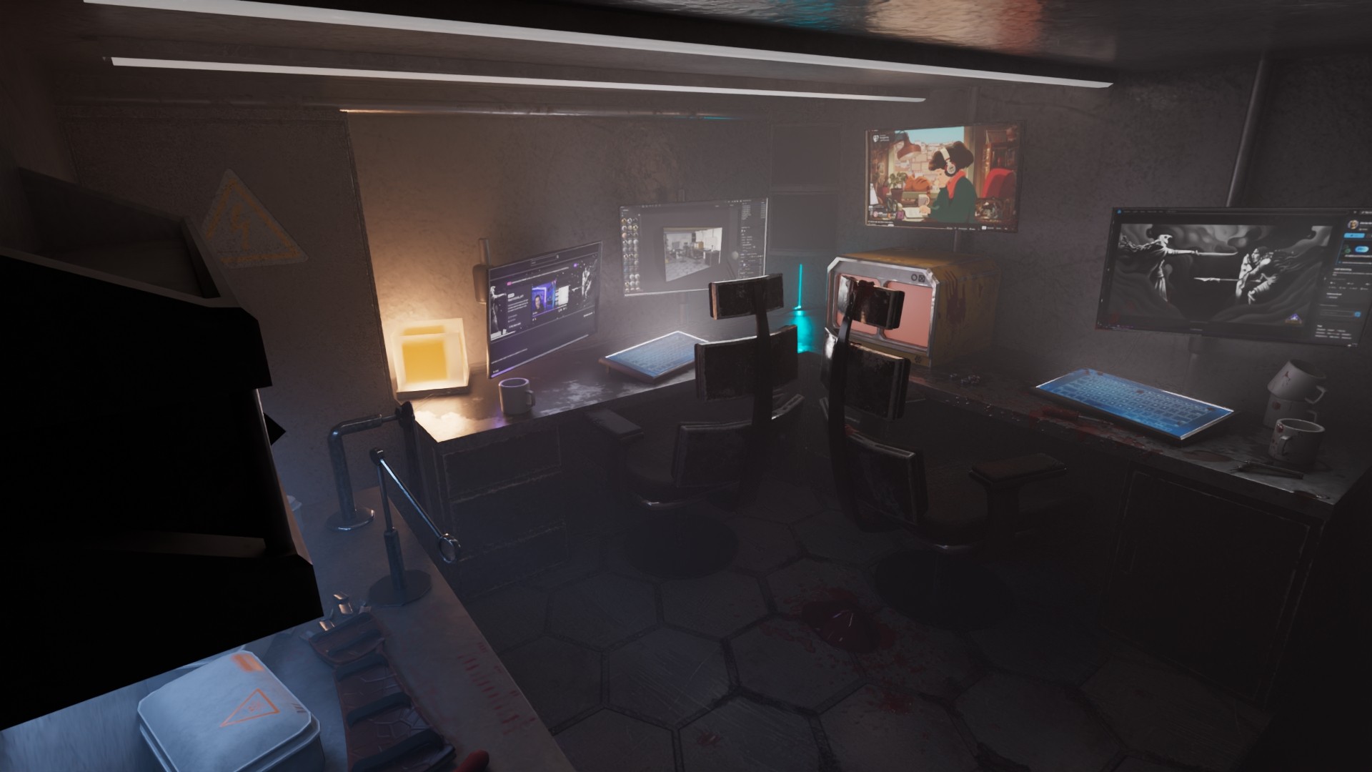 The environment portrays an office space marked by a violent event, using environmental storytelling to imply a darker dystopian context