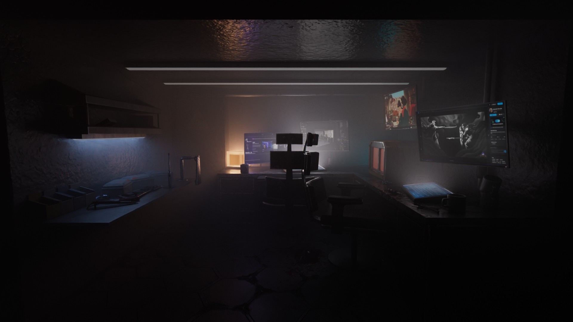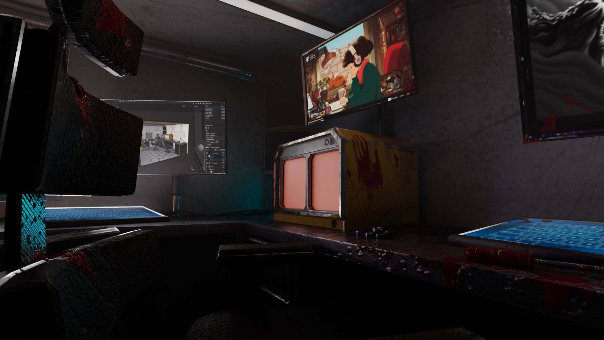 This sci-fi, cyberpunk-inspired office murder scene is part of a larger science-fiction world currently in development.