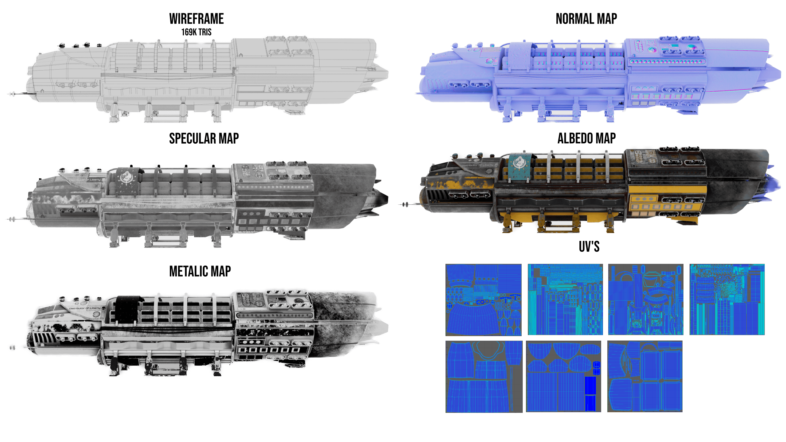 The renders below are Arnold renders at 1080p with 7 materials using 2k textures and a mesh of 100k tris.All materials