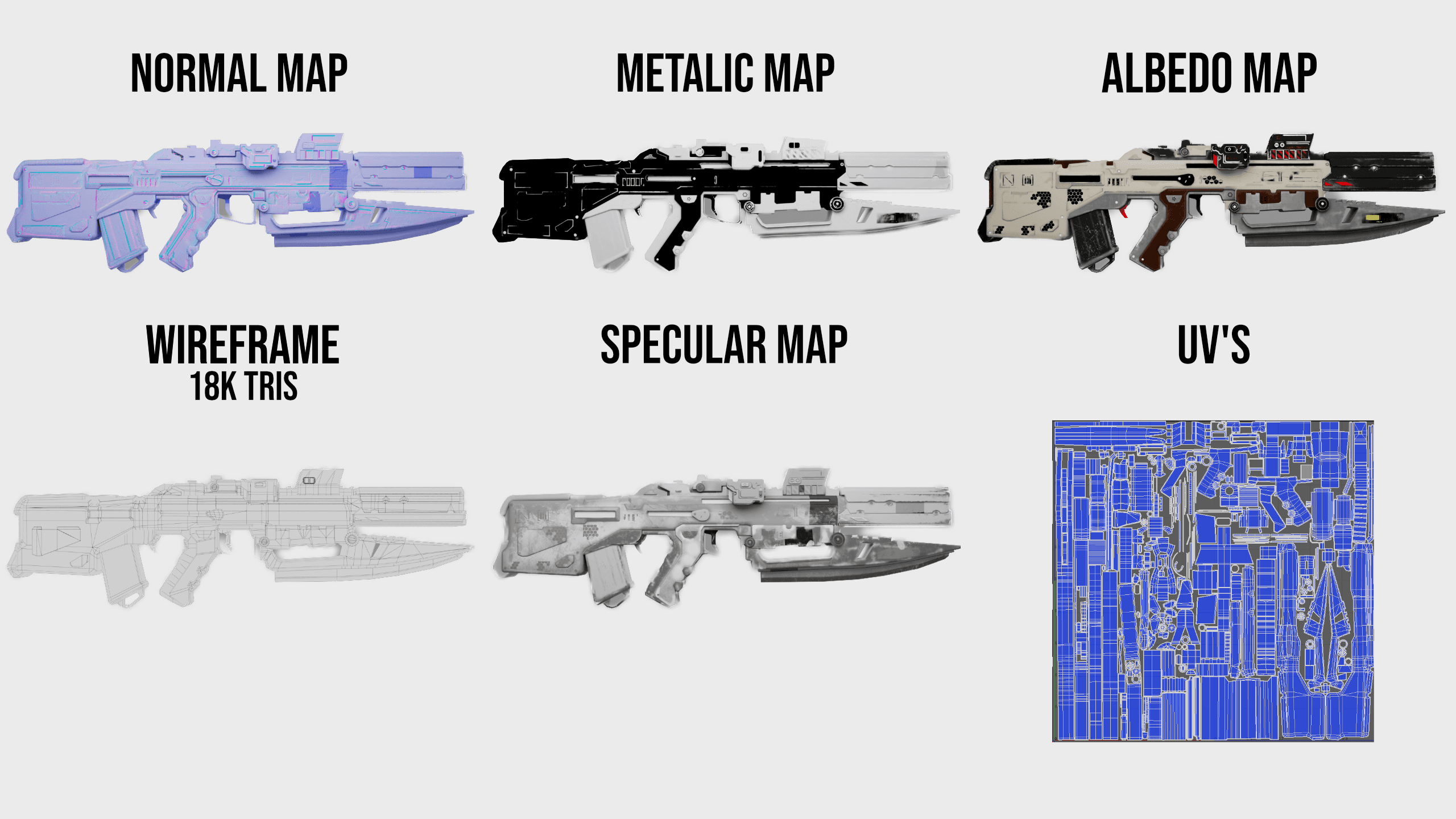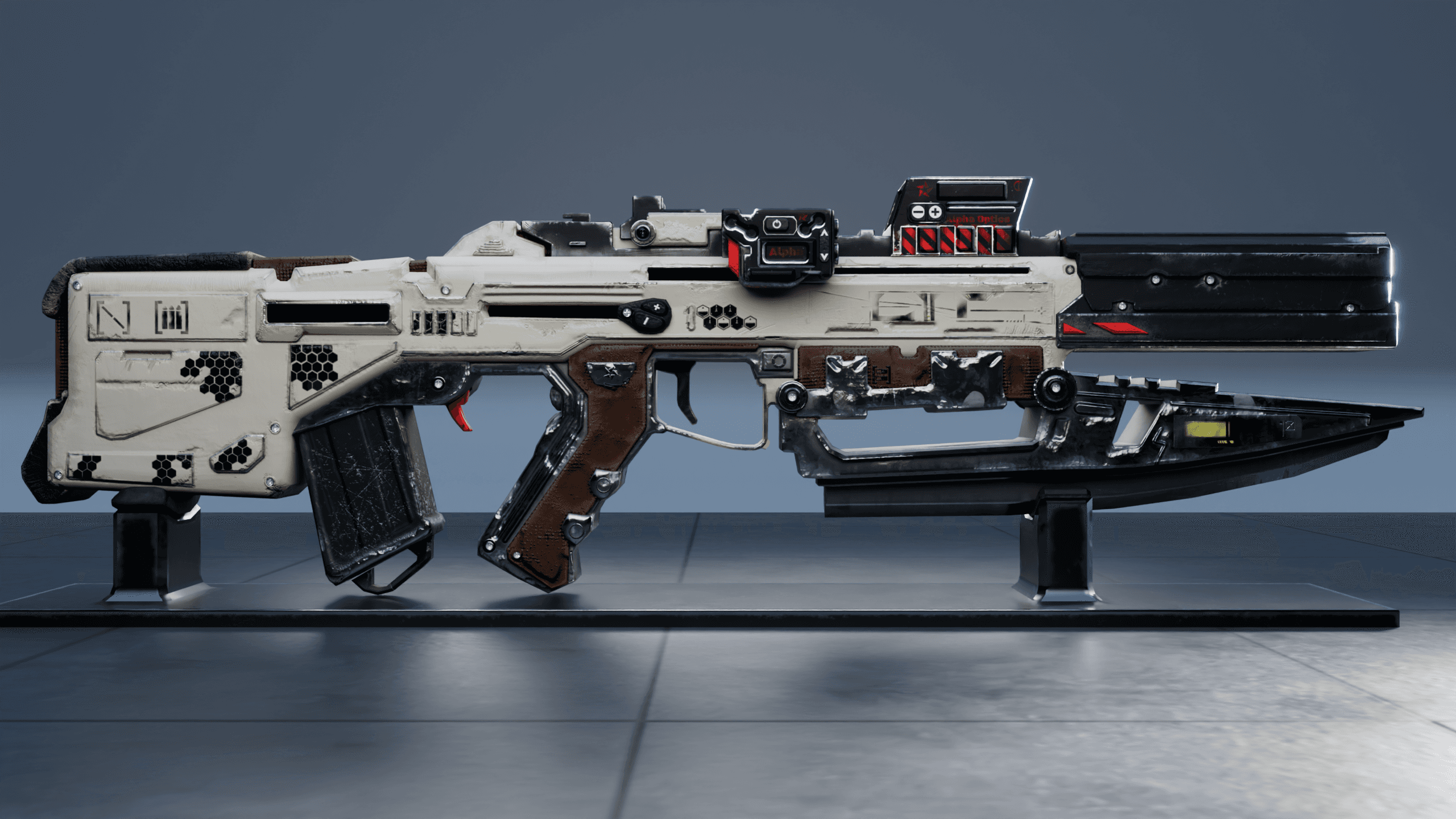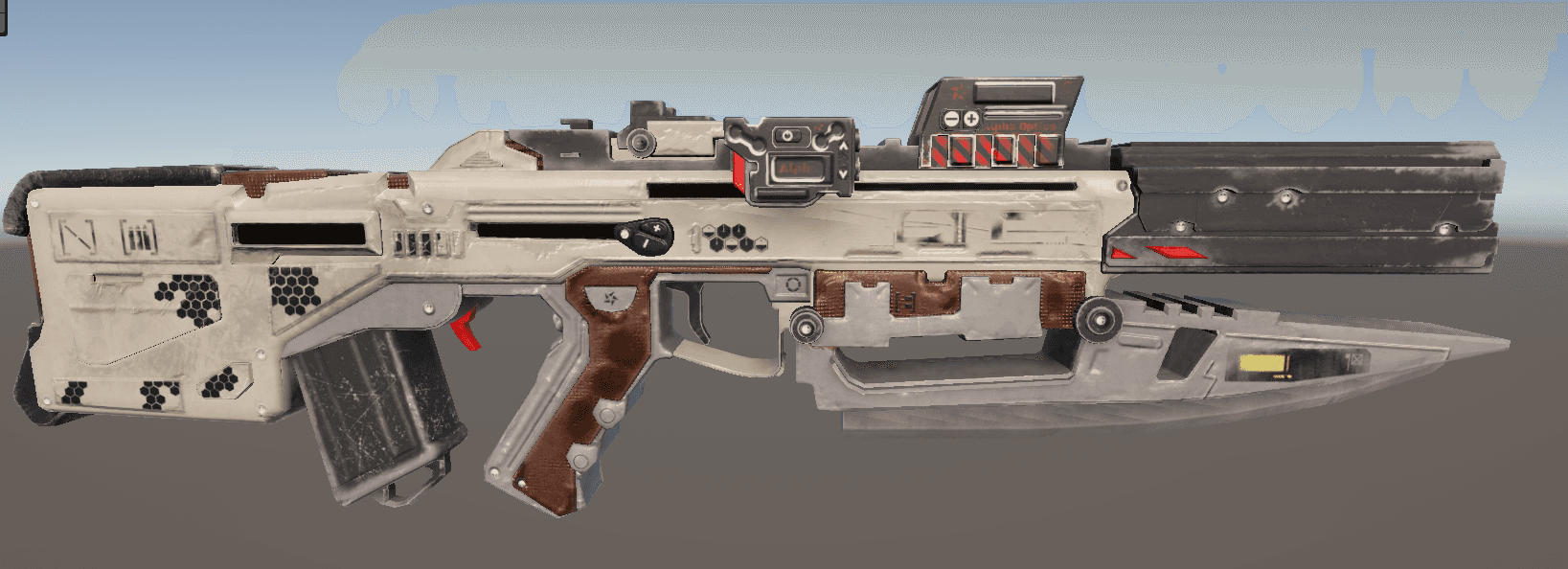 This is a real-time, game-ready sci-fi rifle created as a portfolio piece. It contains around 18k triangles, uses 1 material set, and includes 4K textures.