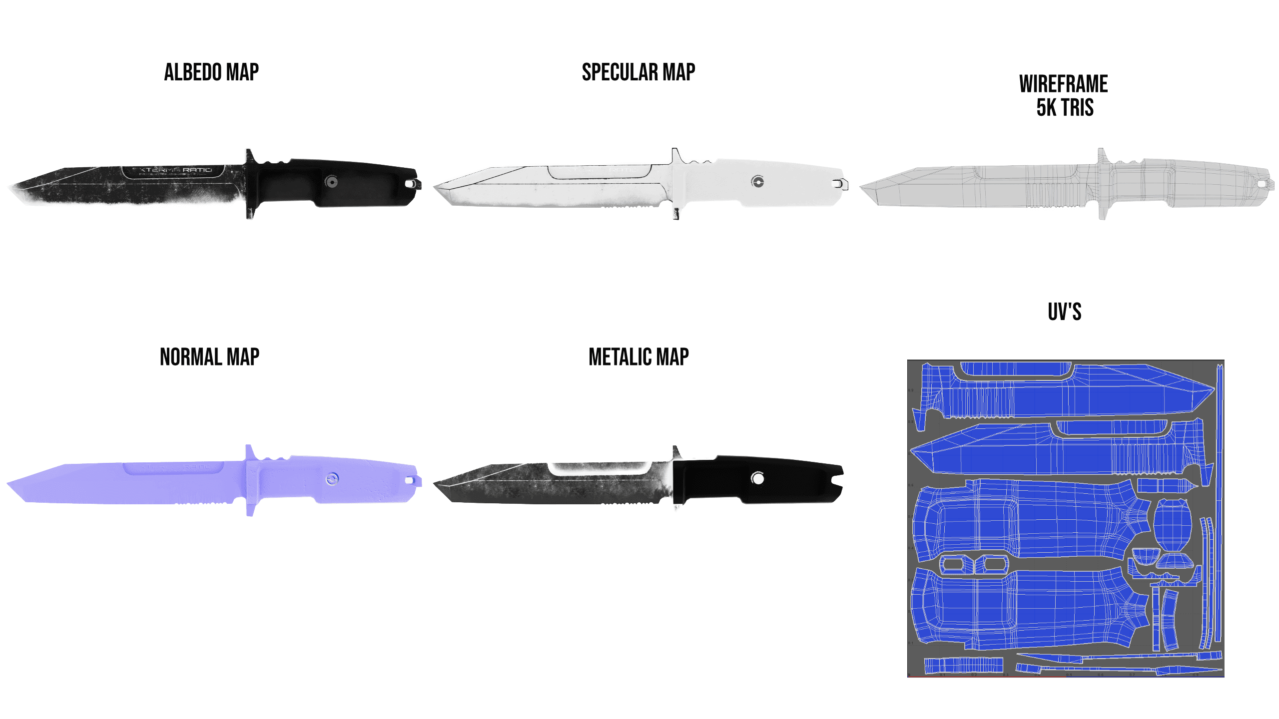 This tactical knife was created as part of a studio art test and completed in one day. The asset follows a full PBR workflow and is optimized for